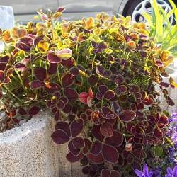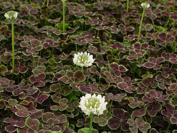 Клевер Pentaphyllum (Пентафиллум). Стебли ползучие стелющиеся, укореняющиеся в узлах, ветвистые. Листья высотой 8 см, сложные тройчатые, бордовые с тонкой зеленой каймой. Цветки белые, собраны в шаровидные головчатые соцветия. Цветоносы длиной 15 см. Цветение в июне. Влаго- и светолюбив. К почве нетребователен.
