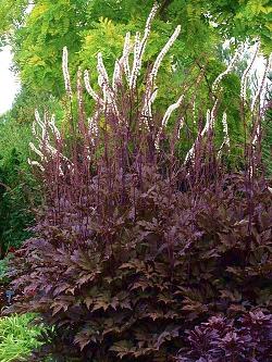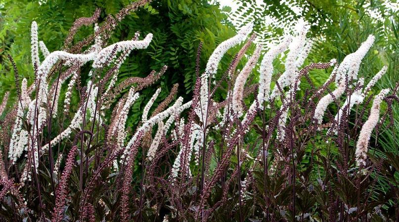 Клопогон Black Negligee (Блэк Неглиже). Один из самых тёмных сортов. Цветки кремово-белые с фиолетовым оттенком, в пушистых соцветиях длиной до 60 см. Листья тёмные пурпурно-чёрные, глубоко-рассечённые, кружевные, эффектные весь сезон. Цветоносы разветвлённые, тёмные.