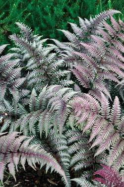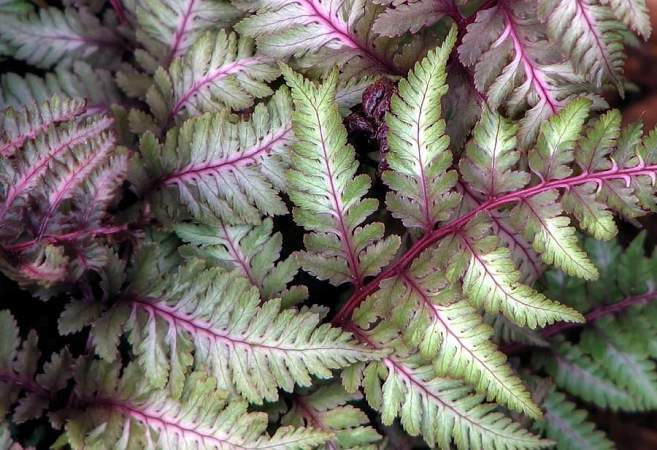 Кочедыжник Red Beauty (Ред Бьюти). Высота взрослого растения — 60 см. Этот папоротник приобрел особую популярность за высокодекоративные листья с металлическим блеском и красно-багряными тонами на стебле и вокруг него. Зимостоек. Предпочитает расти в тени, но для проявления его красноватых расцветок растение должно получать немного солнца — лучше, если это будут утренние лучи до полудня.