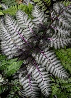 Кочедыжник ниппонский Ursula`s Red (Урсулас Ред). Предпочитает кислую влажную почву в полутени, разрастается быстро. Произрастает в Корее, Японии, Вьетнаме и Китае и приобрел особую популярность за высокодекоративные листья. Вайи серебристо-зеленые, по их центру проходит широкая темная полоса фиолетового оттенка. Черешки и жилки также розово-фиолетовые. Окраска ярче проявляется в светлой полутени.