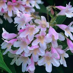 Цветки колокольчатые, ярко-розовые, размещаются попарно в конечных, щитковидных соцветиях диаметром до 7 см, обильно покрывают куст в разгар цветения, делая его очень нарядным.
