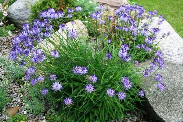 Цветки лиловато-синие, собраны в шаровидные или яйцевидные соцветия до 3 см в диаметре. Цветет в июне-июле 25-30 дней. Плодоносит. Требует богатой кальцием почвы.