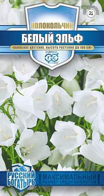 Колокольчик Белый Эльф (персиколистный) Н18. Многолетнее прямостоячее, слабоветвистое растение, высотой до 100. Прикорневые листья продолговато-клиновидные, стеблевые — линейно-ланцетные. Листья лоснящиеся, с зубчатым краем. Цветки ширококолокольчатые, белоснежные, до 4 см в диаметре, собраны в рыхлое кистевидное соцветие. Цветет в июне-июле 30-35 дней. Неприхотлив, хорошо развивается на солнечных или полутенистых на дренированных, с достаточным питанием нейтральных или слабощелочных почвах. Семена высевают прямо в грунт весной в мае или осенью во второй половине октября, или в ящики на рассаду в марте-апреле. Сеют поверхностно или очень мелко, засыпая их тонким слоем песка. Всходы прореживают, после появления третьего листа пикируют в шахматном порядке на расстоянии 5-7 см друг от друга. В июне сеянцы пикируют на грядки, где они растут до следующей весны, затем их высаживают на постоянное место в цветник через 40-50 см. Зацветает на второй год. Удаление увядших цветков и засохших цветоносов продлевает срок цветения. В конце сентября-начале октября все стебли срезают под корень. Используется в групповых посадках, миксбордерах, на срезку