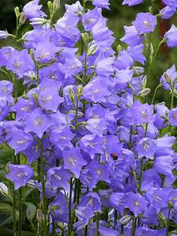 Колокольчик персиколистный. Цветки ширококолокольчатые, голубые, очень крупные, собраны в метельчатые соцветия по нескольку штук. Цветение со второй половине июня и продолжается более месяца. Предпочитает открытые солнечные места с рыхлой суглинистой почвой. Теневынослив.