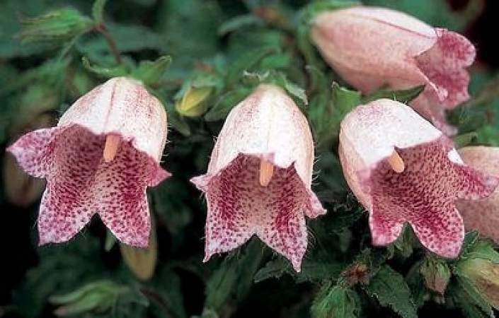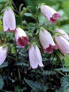 Колокольчик точечный Hot Lips (Хот Липс). Необычный изящный многолетник с бледно-пурпурными цветками снаружи и ярко-пурпурными внутри с сильным опушением, обильно покрывающими весь куст. Листья яйцевидные, зубчатые, темно-зеленые.