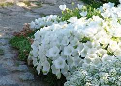 Колокольчик карпатский Rapido White (Рапидо Вайт). Очаровательное невысокое растение с тонкими изящными стеблями, всего 20 см высотой. Цветки крупные, белые, до 5 см в диаметре. Обильно цветет почти все лето, начиная с июня. Растет на солнце и в полутени, зимостоек.