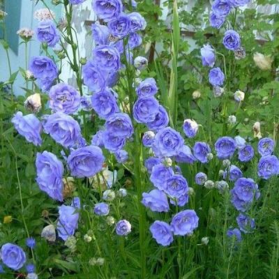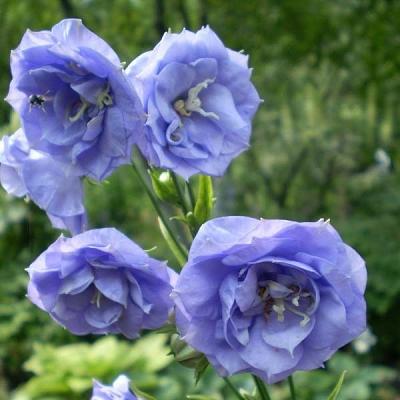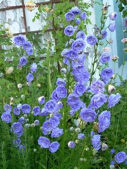 Колокольчик персиколистный La Belle Blue (Ла Белле Блю). Высота растения с цветоносами 60-70 см. Цветки очень крупные, густо махровые, небесно-голубого цвета. Цветет в течение всего лета с июня по август. Предпочитают открытые солнечные места.