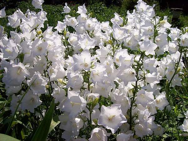 Колокольчик персиколистный Айсберг. Многолетнее прямостоячее, слабоветвистое растение, высотой до 100. Прикорневые листья продолговато-клиновидные, стеблевые — линейно-ланцетные. Листья лоснящиеся, с зубчатым краем. Цветки ширококолокольчатые, белоснежные, до 4 см в диаметре, собраны в рыхлое кистевидное соцветие. Цветет в июне-июле 30-35 дней. Неприхотлив, хорошо развивается на солнечных или полутенистых на дренированных, с достаточным питанием нейтральных или слабощелочных почвах.