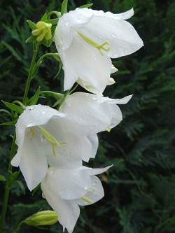 Колокольчик персиколистный Айсберг. Многолетнее прямостоячее, слабоветвистое растение, высотой до 100. Прикорневые листья продолговато-клиновидные, стеблевые — линейно-ланцетные. Листья лоснящиеся, с зубчатым краем. Цветки ширококолокольчатые, белоснежные, до 4 см в диаметре, собраны в рыхлое кистевидное соцветие. Цветет в июне-июле 30-35 дней. Неприхотлив, хорошо развивается на солнечных или полутенистых на дренированных, с достаточным питанием нейтральных или слабощелочных почвах.