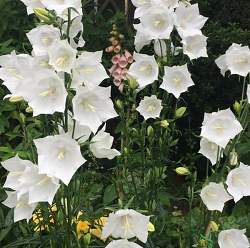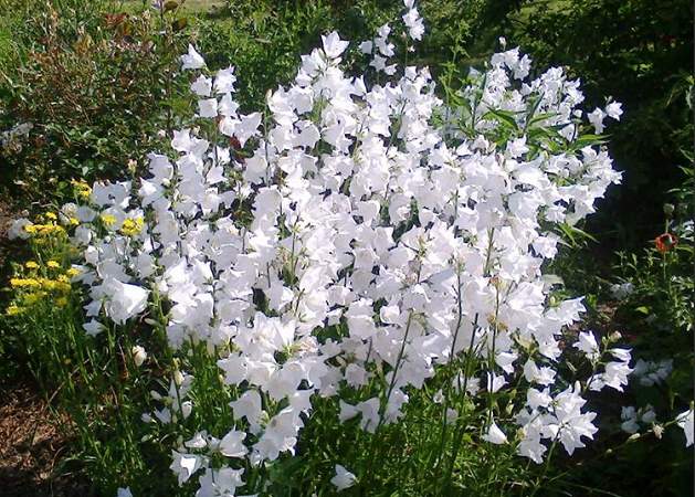 Колокольчик персиколистный Белый Эльф. Многолетнее прямостоячее слабоветвистое растение высотой до 100. Прикорневые листья продолговато-клиновидные, стеблевые — линейно-ланцетные. Листья с зубчатым краем. Цветки ширококолокольчатые, белоснежные, до 4 см в диаметре, собраны в рыхлое кистевидное соцветие. Цветет в июне-июле 30-35 дней. Неприхотлив, хорошо развивается на солнечных или полутенистых на дренированных, с достаточным питанием нейтральных или слабощелочных почвах.