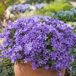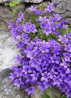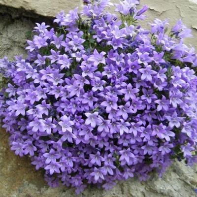 Колокольчик Портеншлага. Подушковидный многолетник до 15 см высотой. Разрастается до 30 см в ширину. Характер роста подушковидный. Листья округлые, плющевидные, вечнозеленые. Цветки почти полностью раскрытые звездчатые ярко-фиолетовые по 3-5 на концах стелющихся побегов.
