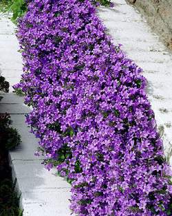 Колокольчик Портеншлага Clockwise (Клоквайз). Подушковидный многолетник до 15 см высотой. Разрастается до 30 см в ширину. Характер роста подушковидный. Листья округлые, плющевидные, вечнозеленые. Цветки почти полностью раскрытые звездчатые ярко-фиолетовые по 3-5 на концах стелющихся побегов.