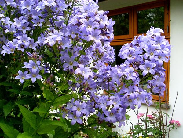 Колокольчик Pouffe (Пуф). Невысокий колокольчик, до 50 см. Образует красивую округлую кочку. Цветки крупные, до 8 см. Цветет чрезвычайно обильно в июне-июле. После обрезки зацветает повторно. Прекрасно смотрится в любых смешанных цветниках, на переднем плане композиций, в бордюрах.