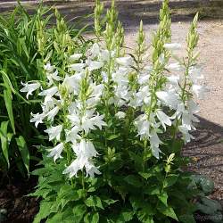 Колокольчик широколистный Alba (Альба). Красивый и легкий в уходе многолетник высотой до 120 см. Листья покрыты редким мягким пушком. Соцветия кистевидные. Цветки крупные, белоснежные. Цветение обильное и очень заметное в середине лета.