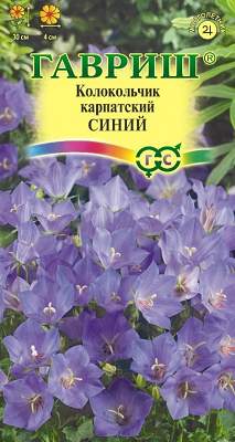 Колокольчик Синий (карпатский). Многолетнее растение семейства Колокольчиковые, высотой 20-30 см. Образует куст диаметром 35-40 см. Относительно влаголюбивое и холодостойкое, растет на солнце и в полутени. Цветки одиночные, крупные, чашевидные, направлены вверх, диаметром 4-5 см, синего цвета. Цветет в июне-сентябре. Высевают в мае-начале июня. Высаживают на постоянное место в сентябре на расстоянии 30 см. Цветет на второй год. Можно выращивать как однолетник. Тогда сеют в феврале, высаживают в мае на расстоянии 15-20 см. Зацветает в 1-й год. Высаживают на горках, рабатках, в миксбордерах и контейнерах.