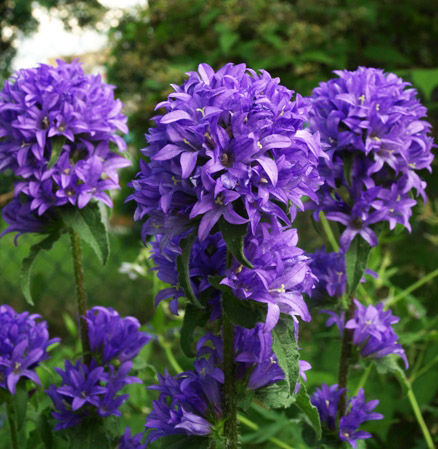 Колокольчик скученный. Многолетнее растение. Цветки темно-фиолетовые, до 2 см в диаметре, в верхушечных и пазушных головчатых соцветиях до 20 шт. Цветет в июне-июле 30-35 дней. Плодоносит. После цветения стебли отмирают вместе с розетками прикорневых листьев, но перед этим образуется множество новых розеток, и растение продолжает свою жизнь.