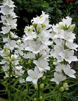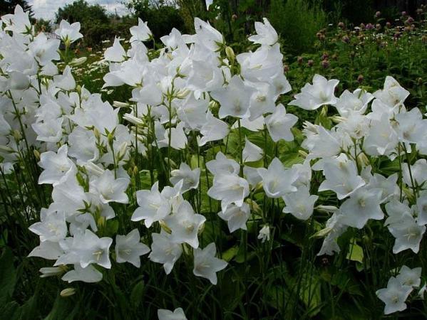 Колокольчик персиколистный Takion White (Такион Уайт). Цветки ширококолокольчатые, белые, крупные, 4-5 см в диаметре, собраны в метельчатые соцветия по несколько штук. Цветение со второй половине июня и продолжается более месяца. Предпочитает открытые солнечные места с рыхлой суглинистой почвой. Теневынослив.