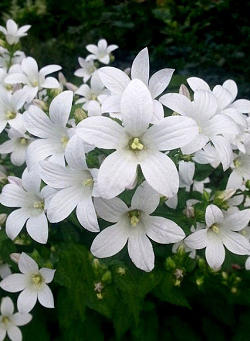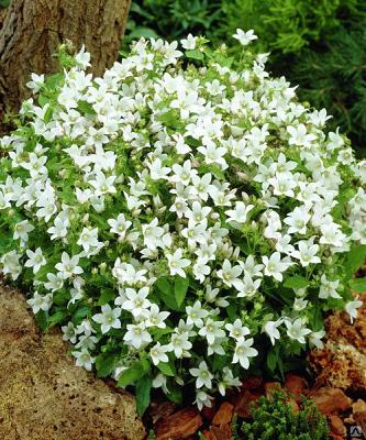 Колокольчик White Pouffe (Вайт Пуф). Невысокий колокольчик, до 50 см. Образует красивую округлую кочку. Цветки крупные, до 8 см. Цветет чрезвычайно обильно в июне-июле. После обрезки зацветает повторно. Прекрасно смотрится в любых смешанных цветниках, на переднем плане композиций, в бордюрах.