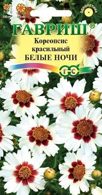 Кореопсис Белые ночи (красильный) Н22. Растение однолетнее с прямым тонким ветвистым стеблем, высотой до 120 см. Листья дважды-перисторассеченные на линейные доли. Соцветия на длинных цветоножках, одиночные, 2,5 см в диаметре. Окраска цветков белая с бордовым центром. Кореопсисы неприхотливы, обладают быстрым ростом, обильным и ранним цветением, предпочитают открытые солнечные места на плодородных, достаточно увлажненных почвах, холодостойки. Посев семян проводят в апреле на рассаду, высадку в грунт — в мае, посев в открытый грунт — в апреле-мае или под зиму. Цветет с июля до заморозков. Используют для оформления сборных цветников, в качестве фоновых растений. В срезке стоят дольше недели.