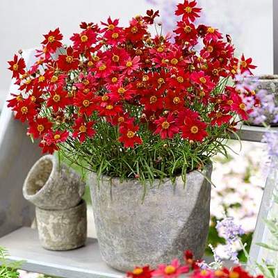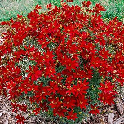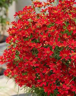 Кореопсис Hot Paprika (Хот Паприка). Новинка из серии Sizzle & Spice. Невысокий сорт (25 см) с тонкими побегами и нитевидными листьями. Цветки алые, средней величины, с длинными лепестками. Цветение чрезвычайно обильное и продолжительное, с июля до заморозков.