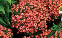 Кореопсис Little Penny (Литл Пенни). Это невысокое многолетние растение не только обладает декоративным внешним видом, но и неприхотливо в уходе. Достигает высоты 35 сантиметров, достаточно густые побеги образуют небольшой кустарник раскидистой формы. Продолговатые листья окрашены в яркий зеленый цвет. Цветет с июня по июль.