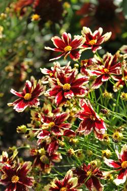 Кореопсис Ruby Frost (Руби Фрост). Это невысокое многолетние растение не только обладает декоративным внешним видом, но и неприхотливо в уходе. Достигает высоты 35 сантиметров, достаточно густые побеги образуют небольшой кустарник раскидистой формы. Продолговатые листья окрашены в яркий зеленый цвет. Цветет с июня по август.