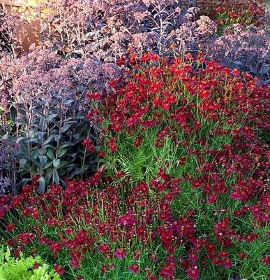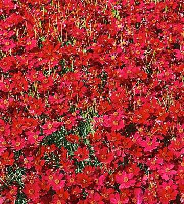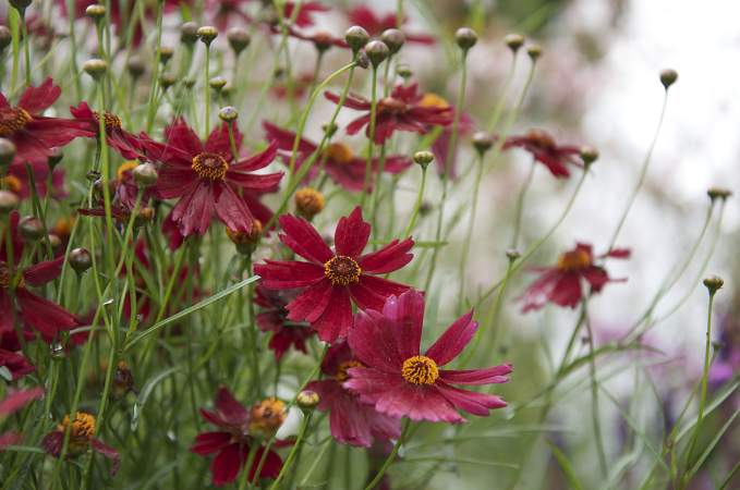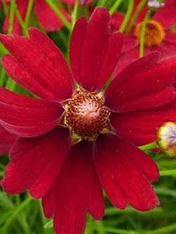 Кореопсис Ruby Red (Руби Ред). Цветки ромашковидные, многочисленные, красные, крупные. Цветение обильное и продолжительное, в июне-августе. Листья узкие. Высота листьев 40 см. Высота цветоносов 50-60 см. Место солнечное. Почва влажная, дренированная.