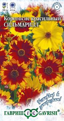 Кореопсис Сильмарилл (красильный). Красивоцветущая, окрашенная в веселые солнечные тона, смесь. Растение однолетнее, с прямым тонким ветвистым стеблем. Листья дважды-перисторассеченные на линейные доли. Соцветия на длинных цветоножках, одиночные, яркие, до 4-5 см в диаметре. Окраска язычковых цветков от золотисто-желтой до коричнево-красной и бархатисто-пурпурной, трубчатых — темно-коричневая.