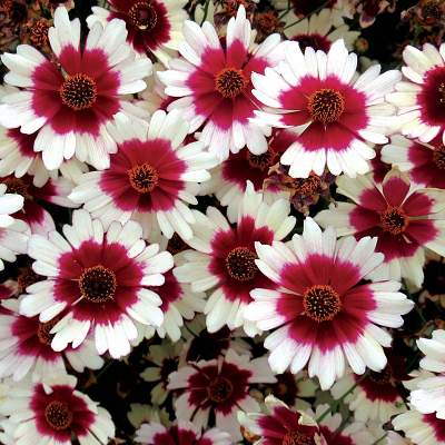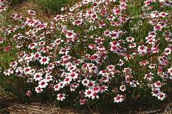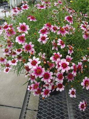 Кореопсис Sweet Dreams (Свит Дримс). Яркий сорт с контрастной окраской. Язычковые цветки белые или розовые, у основания красные. Соцветия около 2 см в диаметре. Высота куста около 30-40 см.