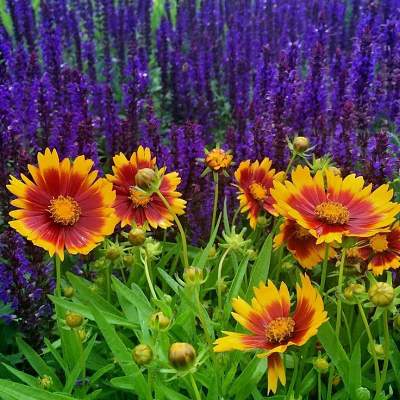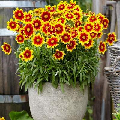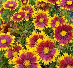 Кореопсис Uptick Gold (Аптик Голд). Компактный сорт из серии UpTick. Многолетник, образующий аккуратную кочку из средне-зеленых листьев. Цветет непрерывно с середины лета до осени. Цветение чрезвычайно обильное. Цветки крупные, яркие, желто-красные. Хорошо растет на солнце, на умеренно влажных, хорошо дренируемых почвах.