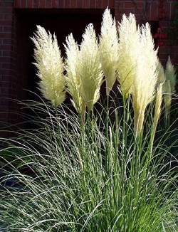 Кортадерия White Plum (Вайт Плам). Невысокий сорт, достигающий в высоту (во время цветения) около 60 см. Без колосков высота примерно 30 см. Трава очень эффектная, сорт может зимовать в 4 зоне. Для улучшения зимовки нужно в конце осени связать пучок, чтобы получился своего рода шалаш, и замульчировать основание куста торфом или сухими листьями.