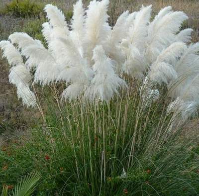 Кортадерия White Plume (Вайт Плюм). Невысокий сорт, достигающий в высоту (во время цветения) около 60 см. Без колосков высота примерно 30 см. Трава очень эффектная, сорт может зимовать в 4 зоне. Для улучшения зимовки нужно в конце осени связать пучок, чтобы получился своего рода шалаш, и замульчировать основание куста торфом или сухими листьями.
