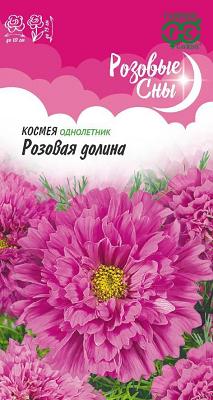 Космея Розовая долина махровая. Роскошное однолетнее растение из семейства Астровые, высотой до 75 см. Необыкновенной формы махровые цветки (до 10 см в диаметре), нежно-розового цвета, "парят" над ажурными листьями пышного куста. Цветет обильно с июля до заморозков. Космея холодостойка и светолюбива, относительно засухоустойчива. К почвам нетребовательна, предпочитает рыхлые, умеренно плодородные почвы. Выращивают прямым посевом в грунт в конце апреля-начале мая, либо под зиму. Используется для посадки на клумбах, в миксбордерах для декорирования оград и стен зданий, высаживают в качестве заднего фона бордюра. Успешно распространяется самосевом.