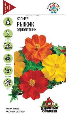 Космея Рыжик DH. Однолетнее сильноветвящееся растение из семейства Астровые высотой до 100 см. Цветет обильно с июля до заморозков. Цветки полумахровые, крупные (10-12 см в диаметре) красной, желтой, оранжевой и лимонной окраски. Холодостойка и светолюбива, относительно засухоустойчива. К почвам нетребовательна, предпочитает рыхлые, умеренно плодородные почвы. Выращивают прямым посевом в грунт весной, либо под зиму. Используется для посадки на клумбах, в миксбордерах для декорирования оград и стен зданий.