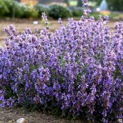 Котовник Фассена Purrsian Blue (Пёрсиан Блу). Сорт компактный, 45х60. Куст округлый, цветки синие, ароматные. Цветет обильно, после цветения можно обрезать и получить второе, не менее обильное цветение. Листья серовато-зеленые, опушенные, ароматные.