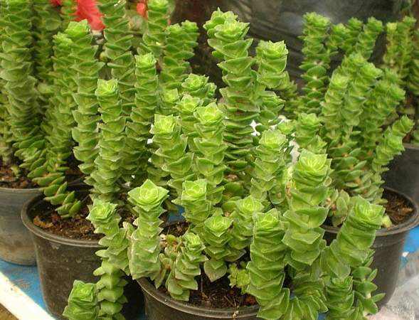Крассула (толстянка) перфората. Очень популярна среди любителей суккулентов. Неприхотливый быстрорастущий вид. При содержании на северных окнах побеги теряют компактность. На солнце выглядит существенно лучше — ребра листьев приобретают красноватую окраску, растение стройнее, листья посажены плотнее.