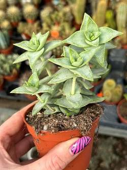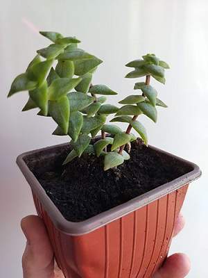 Крассула (толстянка) перфората. Очень популярна среди любителей суккулентов. Неприхотливый быстрорастущий вид. При содержании на северных окнах побеги теряют компактность. На солнце выглядит существенно лучше — ребра листьев приобретают красноватую окраску, растение стройнее, листья посажены плотнее.