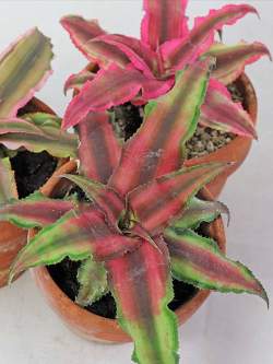 Криптантус двухполосый — очень эффектная, популярная бромелия, имеющая декоративные полосатые листья. Период декоративности длится круглый год. Хорош для садиков. Размер 5-7,5 см. Листья 7,5-10 см длиной, собраны в плотные небольшие розетки до 15 см в диаметре, линейно-ланцетовидные, заостренные, по краю мелкозубчатые и волнистые, светло-зеленые с двумя светлыми продольными полосами. Цветы малодекоративные, белые, появляются редко в течение года.