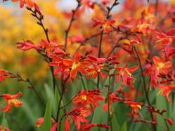 Крокосмия Carmine Brilliant (Кармин Бриллиант). Обаятельное многолетнее клубневое растение высотой до 60 см. Название происходит от греческих слов "krokos" — шафран и "osme" — запах. В народе растение получило еще одно название — "японский гладиолус".