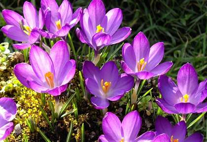 Крокусы крупноцветковые. Очень плодовитые неприхотливые растения, которые украшены действительно крупными бокаловидными цветками: в среднем раза в 2 крупнее, чем у диких предков. Многие гибриды различаются незначительными деталями окраски или размером, что становится заметным только при совместном выращивании.