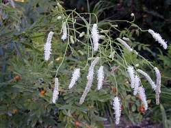 Кровохлебка мелкоцветковая White (Вайт). Мощное, до 1 м высотой, но изящное растение с ветвистыми стеблями и многочисленными длинными (до 7 см), узкими белыми поникающими соцветиями. Листочки у нее, в отличие от вышеописанных видов, узкие (5-10 мм шириной), почти линейные.