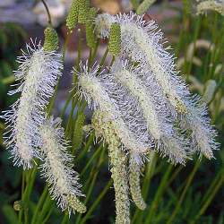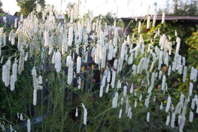 Кровохлебка тонколистная. Травянистый многолетник с белыми поникающими соцветиями. Тонкий стебель украшают длинные ярко-зеленые перистые листья. Высота кровохлебки тонколистной составляет 100 см. Цветение в период июль-сентябрь.
