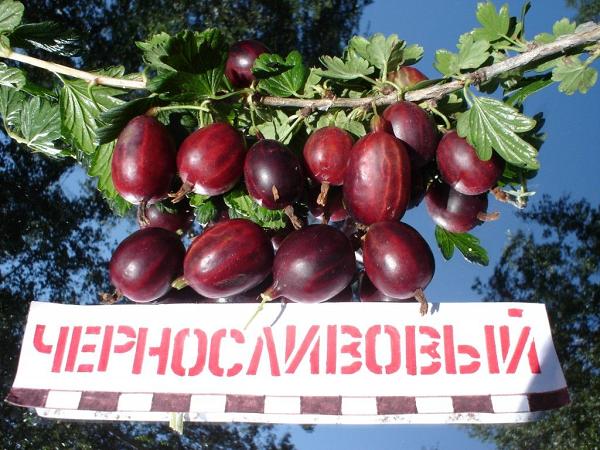 Крыжовник Черносливовый. Высокая зимостойкость, устойчивость к американской мучнистой росе, слабая шиповатость побегов, хорошие биохимические и технологические качества ягод. Ягоды выше среднего размера (3,8-5,9 г), овальные, темно-красные, при полном созревании почти черные, неопушенные или со слабым простым опушением, покрытые восковым налетом.