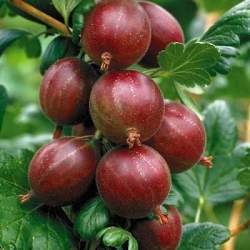 Крыжовник Хиннонмаки Ред. Быстрорастущий выносливый густой куст (до 1,5 м). Дает щедрые урожаи ягод отличного качества. Плоды созревают в июле, крупные, овальные, почти округлые, темно-красные, сладкие, очень вкусные и ароматные.