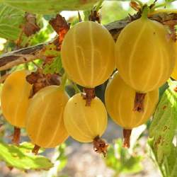 Крыжовник Kursu Dzintars (Куршу Дзинтарс). Ягоды очень ароматные, янтарно-желтые, красивые, отличного сладкого вкуса, кожица тонкая, назначение десертное. Масса ягод 2,7 г. Сорт среднеспелый (начало августа). Латвийская селекция. Куст компактный, среднерослый, шипы одиночные, тонкие. Зимостойкость до -29 °С. Устойчивость к мучнистой росе высокая.