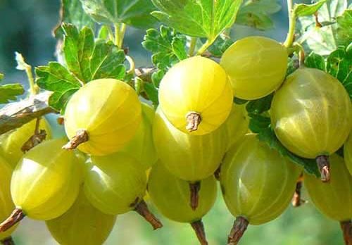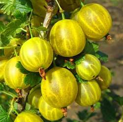 Крыжовник Юбилейный. Сорт среднеспелый, скороплодный, высокоурожайный, зимостойкий. Куст высокорослый, слабораскидистый, шиповатый. Ягоды округлые или округло-овальные, массой 4,0-5,4 г, ярко-жёлтые, с очень редким опушением.
