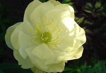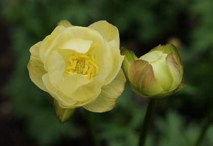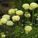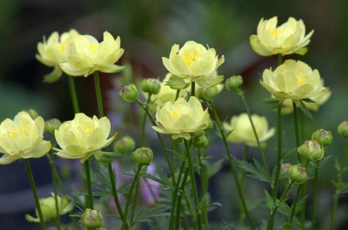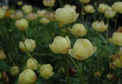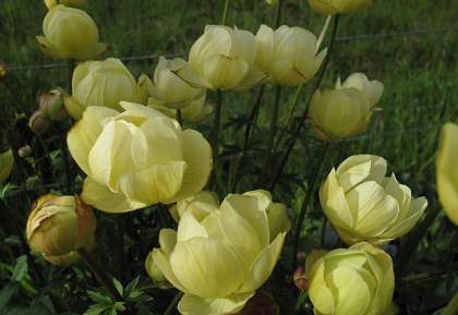 Купальница гибридная Cheddar (Чеддар). Растение с прямостоячими ветвистыми побегами, куст не разваливается. Цветы округлые, чашевидные, полумахровые, бледно-кремово-желтые. Предпочитает влажную почву на солнце или полутень.