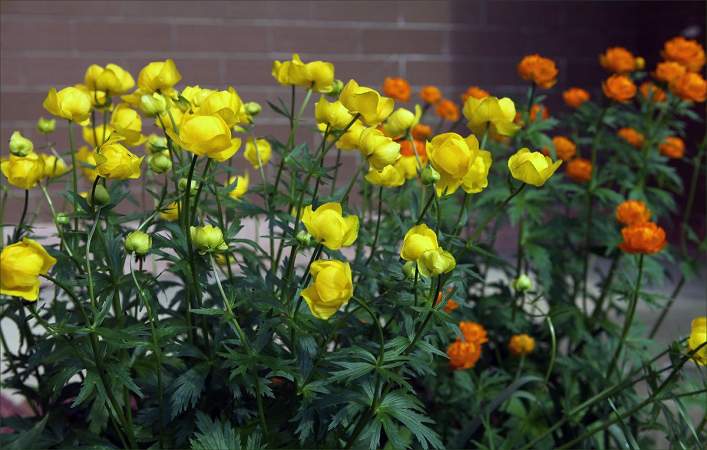 Купальница Earliest of All (Элиест оф Олл). Самая ранняя, зацветает в начале мая. Высота 60 см. Цветки до 4 см в диаметре. Чашелистики темно-желтые. Листья красивые, пальчато-рассеченные. Растение любит влагу, хорошо смотрится в прибрежной зоне.