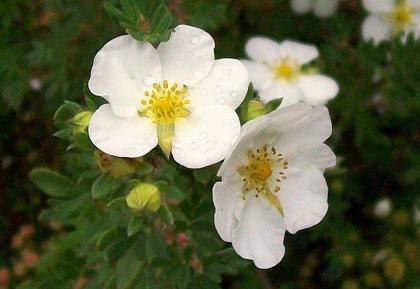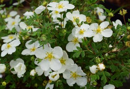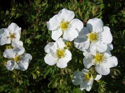Лапчатка кустарниковая Abbotswood (Абботсвуд). Высота и диаметр кроны лапчатки кустарниковой Aбботсвуд около 1 м. Ежегодный прирост в высоту и ширину 20-25 см. Листья длиной 2-3 см сложные, состоят из 5 желтовато-зеленых листочков, осенью желтые. Цветение происходит в июне-августе, белые цветки диаметром до 2,5 см. Предпочитает солнечные места. Нежные листья и цветки делают кустарник достаточно эффектным.