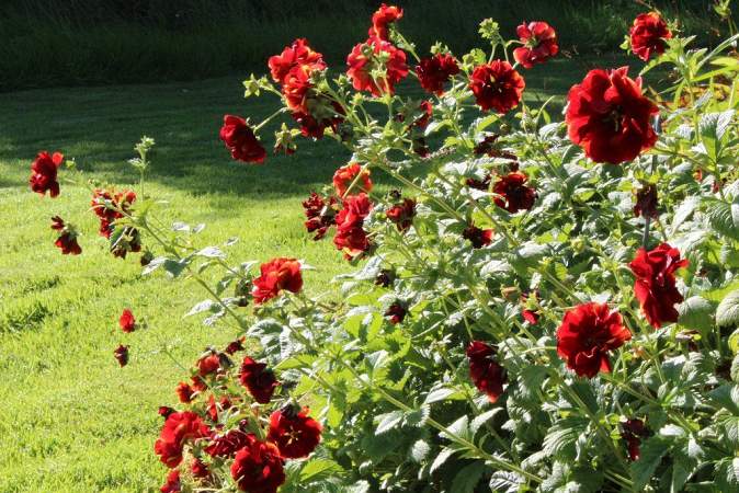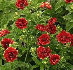 Лапчатка Arс en Ciel (Арк эн Сел). Цветки красные с жёлтыми крапинками по краям лепестков, махровые. Листья маленькие. Высота до 45 см. Предпочитает богатые, умеренно влажные почвы. Светолюбиво, хотя и выносит небольшую полутень.